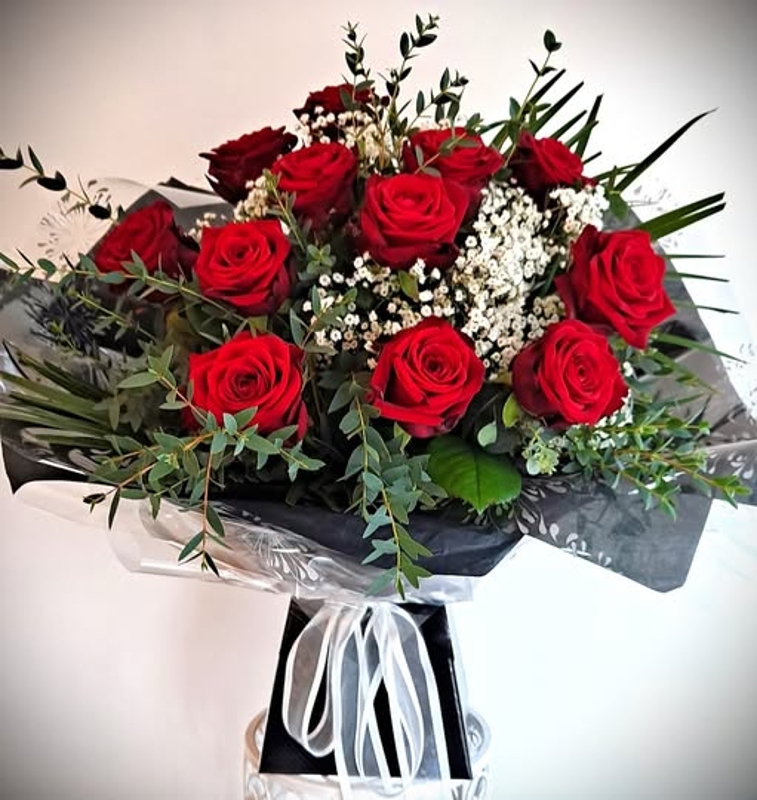 our fabulous roses , wrapped with gypsophila / or another pretty flower and seasonal greenery { may vary)
