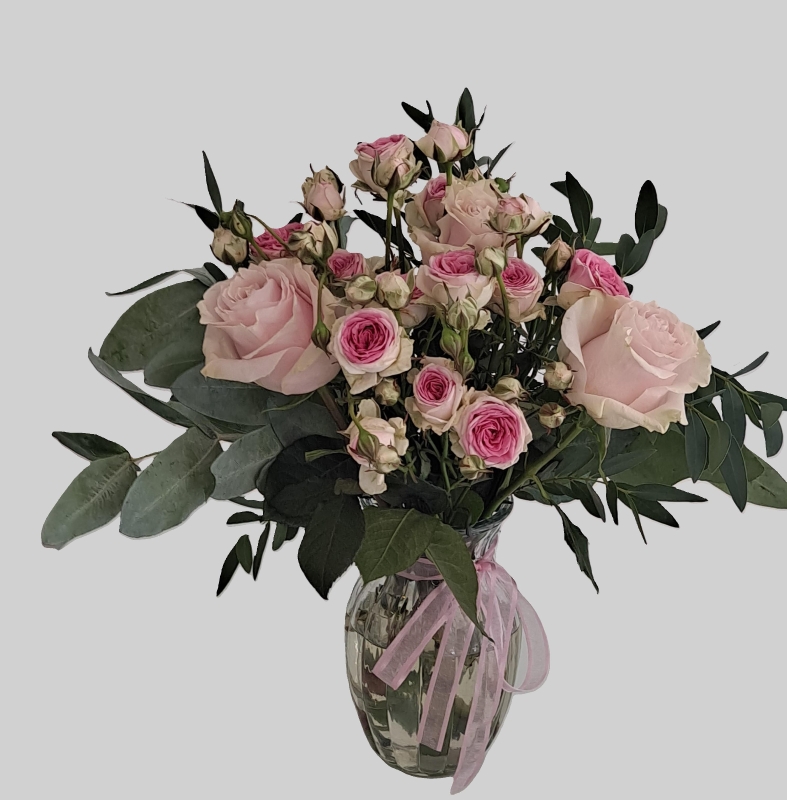 Roses and eucalyptus arranged in water, reusable vase. Florist's colour choice or select below. Sustainable, no cellophane. Vase style may vary.